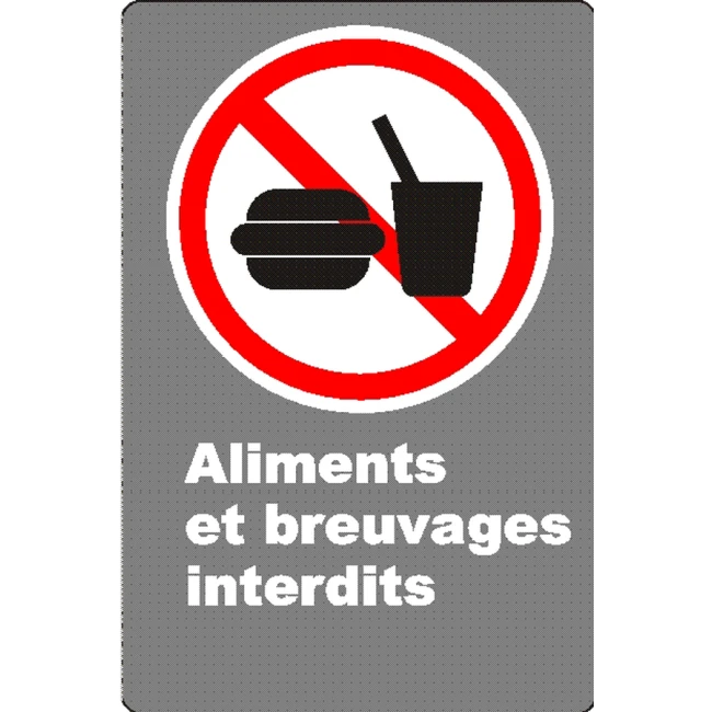 Signs based on the CSAZ31-96 (R2006) standard cover a wide range of circumstances due to their many pictograms, symbols, and captions that allow a plethora of combinations regardless of the areas of activity. Posters based on the CSAZ31-96 (R2006) symbols expresing a general message that states which service is available or regulation is in effect. The "Aliments et breuvages interdits" sign displays a crossed red circle generally symbolizing prohibition.