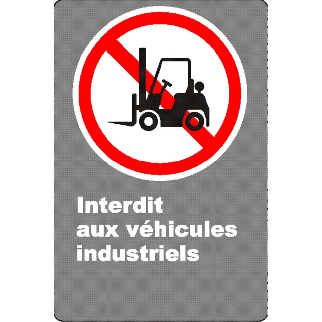 Signs based on the CSAZ31-96 (R2006) standard cover a wide range of circumstances due to their many pictograms, symbols, and captions that allow a plethora of combinations regardless of the areas of activity. Posters based on the CSAZ31-96 (R2006) symbols expresing a general message that states which service is available or regulation is in effect. The "Interdit aux véhicules industriels" sign displays a crossed red circle generally symbolizing prohibition.
