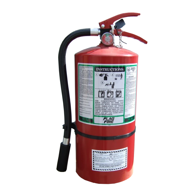 Agent extincteur: FE36. Cylindre en acier couleur rouge. Projette l'agent d'extinction à 14-16 pi. (4.3-4.9 m) durant 13.5 s.