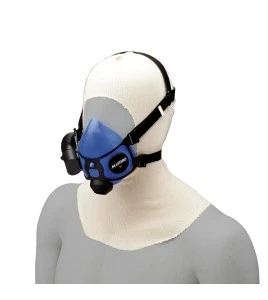This mask stands out with its polycarbonate visor compliant with the ANSI Z87.1 standard, which provides impact protection and replaces safety glasses. It contains no natural rubber latex, making it suitable for allergic individuals. The head harness is equipped with four adjustable elastic straps for stable and comfortable support. This model allows a protection factor of 50 times the permissible exposure limit, provided a quantitative fit test is successfully completed.