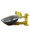 The eye wash station has separate pipes for water intake and drain, and ensures a safe, steady flow of water, even if the water supply pressure varies between 30 and 90 PSI. The bowl is made of heavy-duty stainless steel. The spray heads are equipped with strainers to filter water particulates, and with antimicrobial protection. Yellow plastic caps protect the spray heads from dust. Pipes are made of galvanized steel protected by a yellow Bradtec covering.