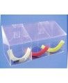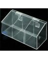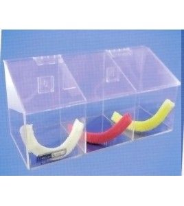 Clear acrylic hairnet dispenser with three vertical bins and slanted hinged lid. Sold individually.
