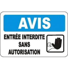 OSHA signs cover a wide range of circumstances due to their many headers, pictograms, and captions that allow a plethora of combinations regardless of the areas of activity. Signs in compliance with the applicable OSHA standards and featuring the “Notice” header convey an informative message about a general situation or a particular rule in effect. The “Avis Personnel autorisé seulement” sign features a blue rectangle at the top on a white background which indicates a notice, thus it shall never be used to identify a danger, a warning or a caution.
