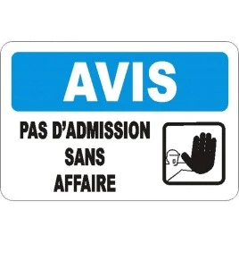 French “Avis Personnel autorisé seulement”—which translates to “Notice Authorized Personnel Only”—sign with a pictogram (for a sign without pictogram, see item EOAV301) of various sizes and different materials: Plastic, aluminium or self-adhesive vinyl. English and bilingual signs also available when local regulations allow it. You can select an optional UV-protecting lamination to preserve the colours longer; for superior visibility, you have an alternative between a retro-reflective pigmentation and a photoluminescent coverage. Sizewise, 7” X 5” and 10” X 7” are the most common sizes sold, but any other format can be cut as long as a special order has been placed. Contact Sylprotec for signs in another language, for custom-made signs or if you want one of the options listed above.