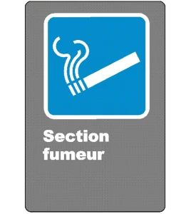 Au Québec, la Loi concernant la lutte contre le tabagisme indique à l’article 2.2 qu’« il est interdit de fumer à l’extérieur [de la plupart des lieux visés à l’article 2] dans un rayon de neuf mètres de toute porte, de toute prise d’air ou de toute fenêtre qui peut s’ouvrir communiquant avec ces lieux. » Cette affiche permet d’identifier rapidement les zones à interdiction de fumer et rappelle l’obligation de respecter la loi.