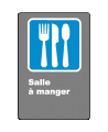 Les affiches basées sur la norme CSAZ31-96 (R2006) couvrent une vaste sélection de situations grâce aux différents pictogrammes, symboles et légendes qui permettent une panoplie de combinaisons pour tous les domaines d’activité. Les affiches inspirées des symboles de la norme de la CSAZ31-96 (R2006) exprimant un message de réglementation servent à indiquer des services ou des règlements. L’affiche « Salle à manger » présente un carré bleu qui indique un message d’information pour le public.