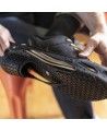 L’innovation ne s’arrête pas là. La doublure intérieure unique adhère efficacement à la semelle de la chaussure pour prévenir tout glissement, tandis que la languette prolongée facilite l’enfilage et le retrait, rendant l’utilisation quotidienne sans effort. Enfin, la semelle s’étend au-delà de la plante du pied pour aux changements de démarche, assurant ainsi une marche naturelle et confortable.