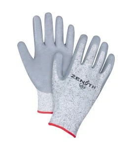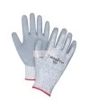 Gant gris anti-coupure, fait en fibre 13 jauges de PEHP, enduite de nitrile poreux, dans la paume de la main et des doigts. Ce gant est perméable aux liquides.