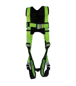 Harnais de sécurité Peakworks de type entrepreneur de classe A et E, avec 3 anneaux en D : 1 anneau dorsal et 2 anneaux sur les épaules pour la récupération en espace clos. Les sangles de la poitrine et des jambes sont réunies par des boucles entrelacées.
