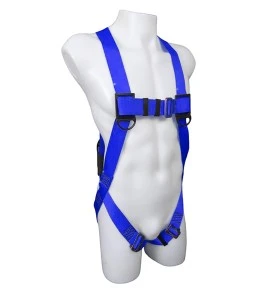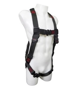 Les sangles de la poitrine et des cuisses sont réunies par des boucles rapides. Ce harnais est muni de 5 points d’ajustements : 2 aux jambes, 2 aux torses et 1 à la poitrine. Les étiquettes d’identification et de certification du produit sont cousues sur les sangles arrière du côté gauche du harnais de sécurité. Il comprend un indicateur de chute pour faciliter l’inspection.