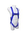 Harnais de sécurité économique de marque Dentec de classe A, avec un anneau dorsal. Ce harnais est constitué de 3 points d’ajustements ; 2 aux jambes et 1 à la poitrine. De plus, il est conçu avec une sangle de soutien sous-pelvienne. Les sangles de la poitrine sont réunies par des boucles entrelacées et les sangles des cuisses le sont par des boucles à ardillons (œillets). Ce harnais est offert en taille universelle, il convient aux travailleurs de tailles médium à extragrand. Le harnais de sécurité Dentec est fabriqué avec des sangles de polyester de couleur bleue.