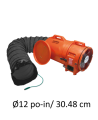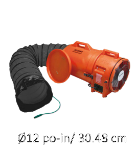 Ventilateur axial anti-explosif de 12 po / 30.4 cm de diamètre pour espace clos. Ce modèle de ventilateur est muni d’un conduit souple avec armature de 12 po / 30.4 cm de diamètre par 25 pieds / 7.62 m de long. Le conduit souple est rangé dans un compartiment rigide amovible qui est relié au ventilateur par des clips rapides. Ce ventilateur aussi appelé souffleur peut à la fois extraire (purger) ou ventiler un espace clos selon l’orientation choisie par l’utilisateur.