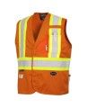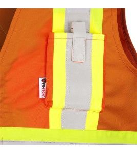 Cette veste orange est munie de bandes argentées rétroréfléchissantes Star Tech® mesurant 50 mm (2 po) de largeur qui qui s’alternent avec des bandes jaune hi-viz. 2 bandes verticales à l’avant, 2 bandes croisées en X à l’arrière et bande horizontale à la taille.