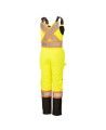 Salopette avec bandes réfléchissantes, 100% imperméables jaune-noir, conçue pour l'hiver et pour la femme en polyester 300 deniers enduits de polyuréthane avec une doublure chaude en polyester molletonné de 5.30 oz/vg2 - 180 g/m2 vendus à l’unité. Conforme aux normes ANSI/ISEA 107-2020 et CSA Z96-22 classe 2 niveau 2.