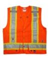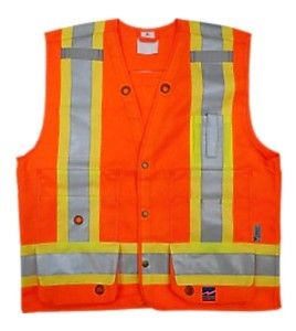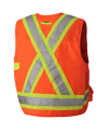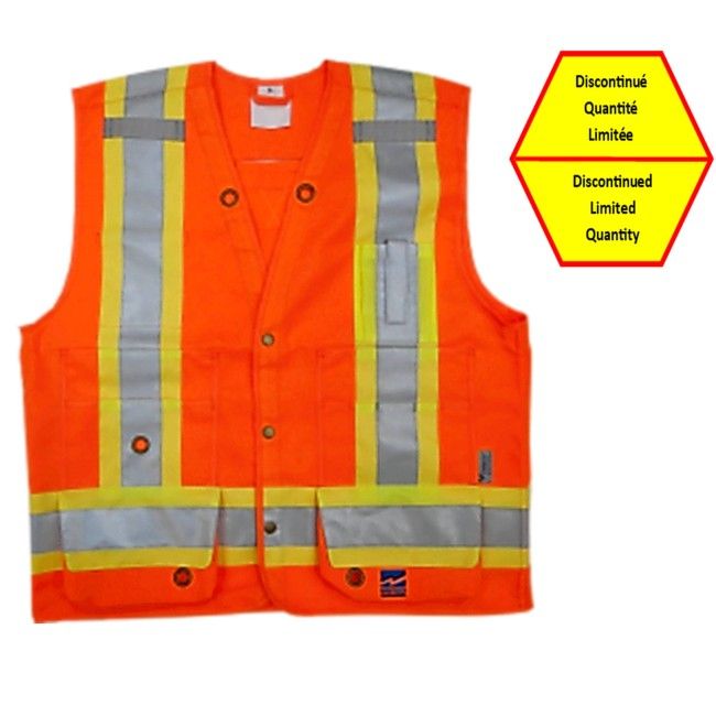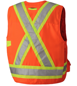 Veste d’arpenteur économique haute visibilité orange fluorescent, à bandes rétroréfléchissantes argentées et jaune fluorescent.